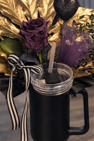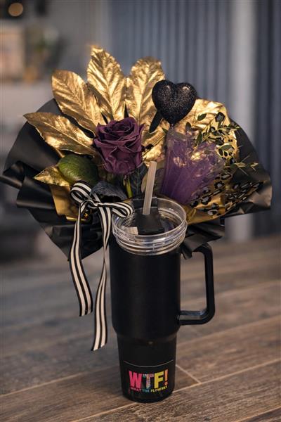 Amethyst One features a single moody rose in deep purple and plum tones, styled in a cup and finished with touches of gold foliage for a refined, dramatic finish. This design delivers impact without excess, proving that one stem can still say a lot.