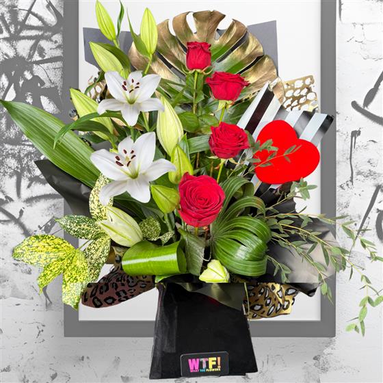 Classic Lily & Rose – Red Velvet brings together rich red roses and elegant lilies to create a Valentine’s bouquet that feels both traditional and elevated. This design leans into classic romance while adding texture, movement and a refined WTF finish.