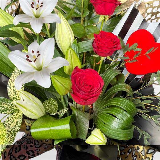 The contrast between velvety red roses and sculptural lilies gives this bouquet presence without excess. It is bold, balanced and designed to feel considered rather than predictable.