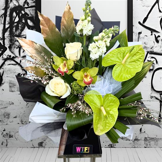 Please note that our florists will create a masterpiece for you and the picture is an example of the ‘Vibe’ that you choose. We use flowers to create art by using the most current, fitting and fresh flowers available. Self-expression and individuality is an important element of what we do and this is how we keep things funky and unique. You can be certain that each one will be as spectacular as the last and sure to create a WTF moment!