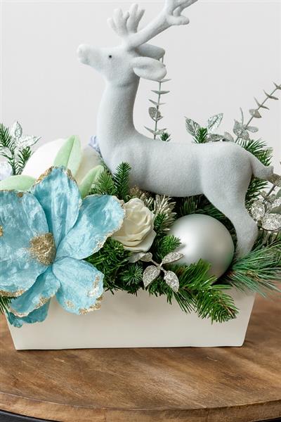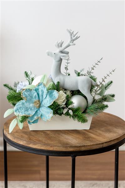 Each centrepiece is carefully hand-crafted in soft pale blue and crisp white tones, featuring elegant seasonal detailing that creates a balanced, graceful design—perfect for capturing the peaceful spirit of a white Christmas.