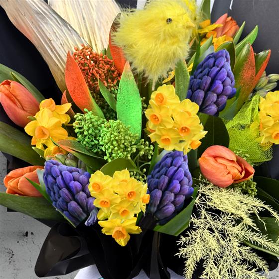 Meet the Spring Bunny, our playful Easter design packed with spring colour and personality. A joyful mix of narcissus, orange tulips, blue hyacinths and neon skimmia, styled with gold bunny ear aspidistra and finished with a fluffy chick for that extra Easter charm.