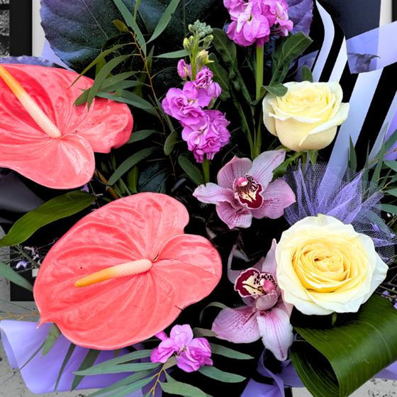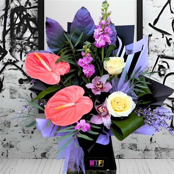 Please note that our florists will create a masterpiece for you and the picture is an example of the ‘Vibe’ that you choose. We use flowers to create art by using the most current, fitting and fresh flowers available. Self-expression and individuality is an important element of what we do and this is how we keep things funky and unique. You can be certain that each one will be as spectacular as the last and sure to create a WTF moment!