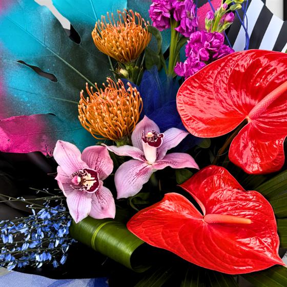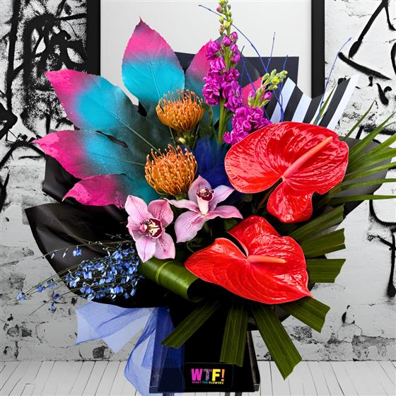 Please note that our florists will create a masterpiece for you and the picture is an example of the ‘Vibe’ that you choose. We use flowers to create art by using the most current, fitting and fresh flowers available. Self-expression and individuality is an important element of what we do and this is how we keep things funky and unique. You can be certain that each one will be as spectacular as the last and sure to create a WTF moment!